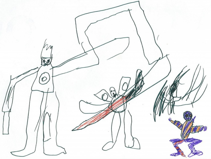 8. Кнопка тревоги. Тот персонаж, который нарисован с большим нажимом, обведен несколько раз, заштрихован, вызывает у «художника» наибольшую тревогу. Тревожность может спровоцировать кто угодно в семье. Нередко взрослые (особенно старшего поколения) неосознанно устанавливают свои программы и табу, а для ребенка они могут нести негативную информацию и страх. Тревожность также может выражаться несмелыми движениями карандаша, слабыми линиями и штрихами.